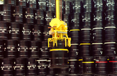 In een hangaar opgestapelde vaten met laagradioactief afval