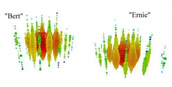 IceCube registreert per jaar honderduizenden neutrino’s, vooral veroorzaakt door de botsing van kosmische straling met atomen en moleculen in de aardse dampkring. Nu bleken ca. 80 neutrino’s zo energierijk te zijn – meer dan een biljoen maal de energie van een lichtfoton – dat ze niet op die wijze kunnen zijn ontstaan. De registratie van twee ervan, Bert en Ernie genoemd, zie in onderstaande illustratie.