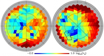 Bovenstaande illustratie geeft de verdeling van stof (rood het meest, blauw het minst) aan de hemel weer, links voor het noordelijk- en rechts voor het zuidelijk halfrond. De ingetekende rechthoek in het rechterbeeld geeft het gebied aan waar BICEP2 heeft waargenomen. Er blijkt meer stof aanwezig te zijn dan gedacht. De teams van Planck en BICEP2 werken nu samen aan dit probleem.