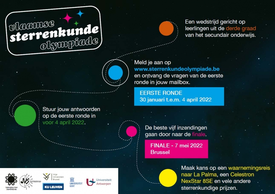 Op zondag 30 januari 2022 gaat de vijftiende editie van de Vlaamse Sterrenkunde Olympiade van start. Deze olympiade richt zich tot leerlingen van het secundair onderwijs (voornamelijk van de derde graad), en wil hun interesse voor sterrenkunde en aanverwante wetenschappen aanwakkeren.